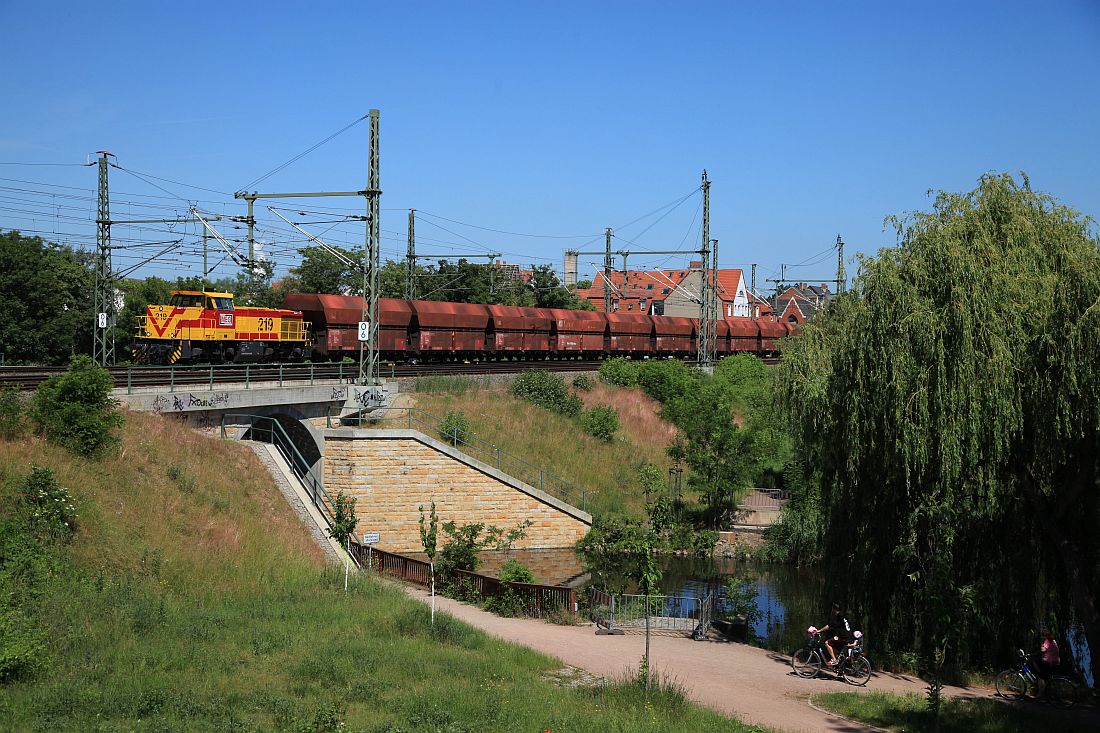 Zu diesem Behufe geht es zunächst nach Merseburg. Vom Hochufer des örtlichen Teichs mitten in der Stadt aus kann man bequem schauen, was so alles aus Halle nach Süden rollt. Dann fahre ich die Strecke