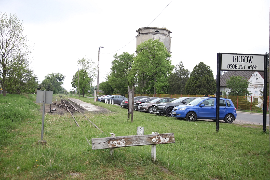 Von Rógow fahren Züge im Frühjahr dienstags (!) ins 8 km entfernte... weiß nicht mehr. Ist auch egal. Das ganze nennt sich "billiger Dienstag" und richtet sich an Kinder- und Schulgruppen. Im Vorfeld habe ich mich bei der Bahnverwaltung schlau gemacht, ob ich dienstags auch als Eizelreisender mitgenommen werde. Nur einen Tag später die Antwort: Ja, kein Problem, ich solle einfach kommen. Hier die noch Zug-lose Station "Rogów Personen-Schmalspurbahnhof" vis-á-vis zu den Normalspurgleisen (hinter dem Wasserturm).