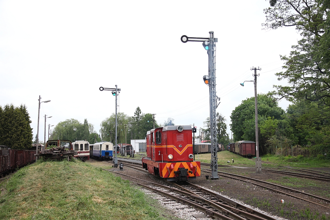 Der Betriebsmittelpunkt liegt einige Hundert Meter weiter und heißt "Rogów Güter-Schmalspurbahnhof". Dorthin laufe ich zu Fuß. Im Schatten teutonischer Signaltechnik macht sich gerade der Zug abmarschbereit.