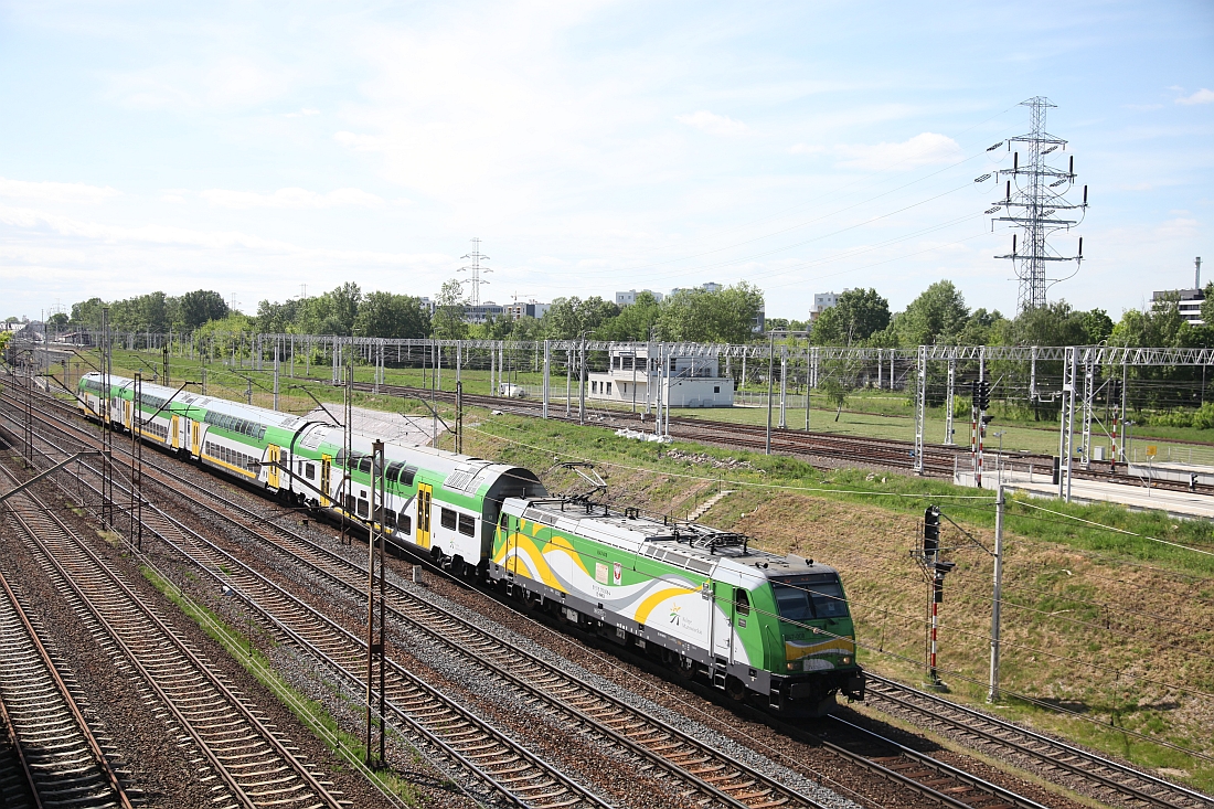 Noch mal die Koleje Mazowieckie (sproch: Koleje Masowjezkije), also die masowische Eisenbahn, mit einem auch aus Deutschland bekannten Typ Zug aus dem Hause Bombardier. Nur der erste Doppelstockwagen sieht irgendwie seltsam aus. Vielleicht eine polnische Raubkopie?