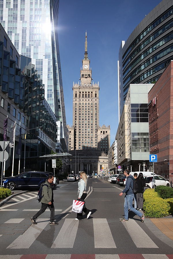 Der (ohne Antenne) fast 200 m hohe Kulturpalast im stalinischen Zuckerbäckerstil, wie man es aus Russland kennt. Sicher das bekannteste Gebäude der Stadt. Vorne sortieren sich die Beatles (poln.: Bytlz) 2.0 auf dem Zebrastreifen der uł Abbey.