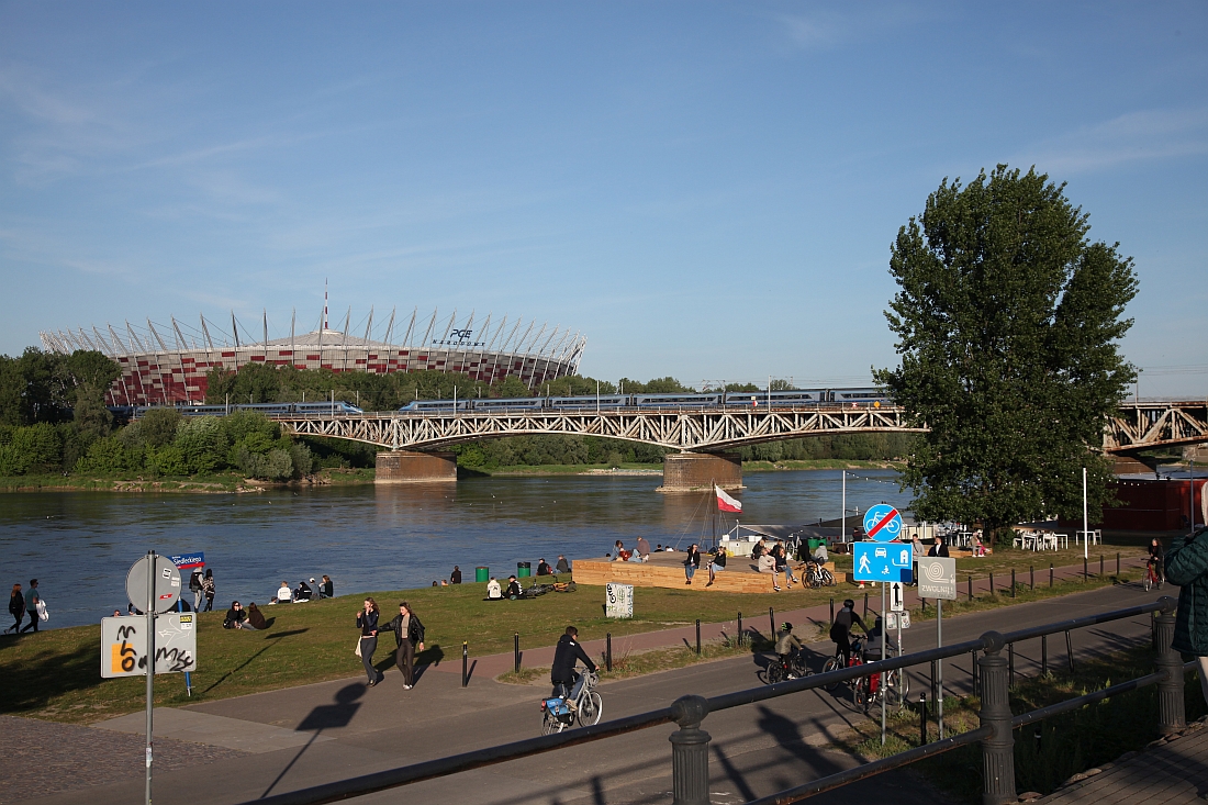 Nach dem trüben Vormittag in Rogów wird es zum Nachmittag hin richtig schön! Richtig schön ist es auch am Weichselufer, wo ich vor der Kulisse des Zentralstadions einfach mal nichts mache, Züge und Pol*Innen gucke und die Sonne genieße.