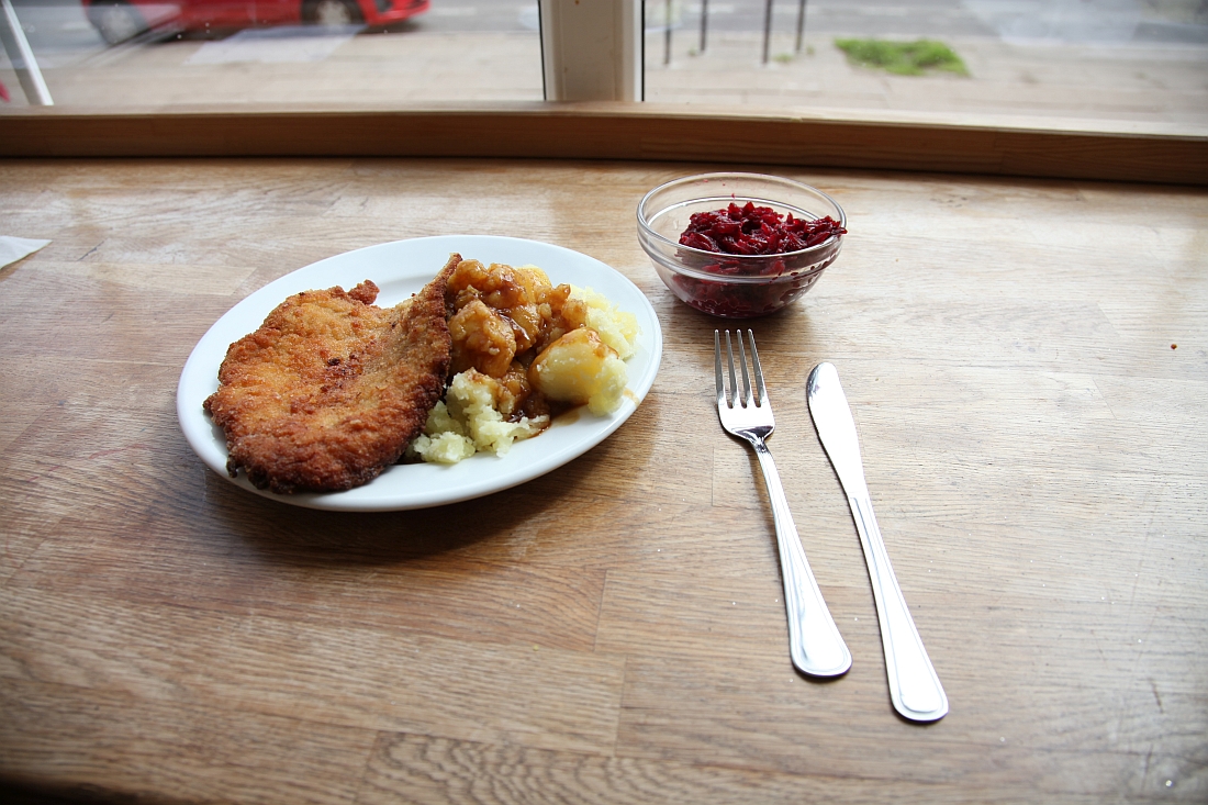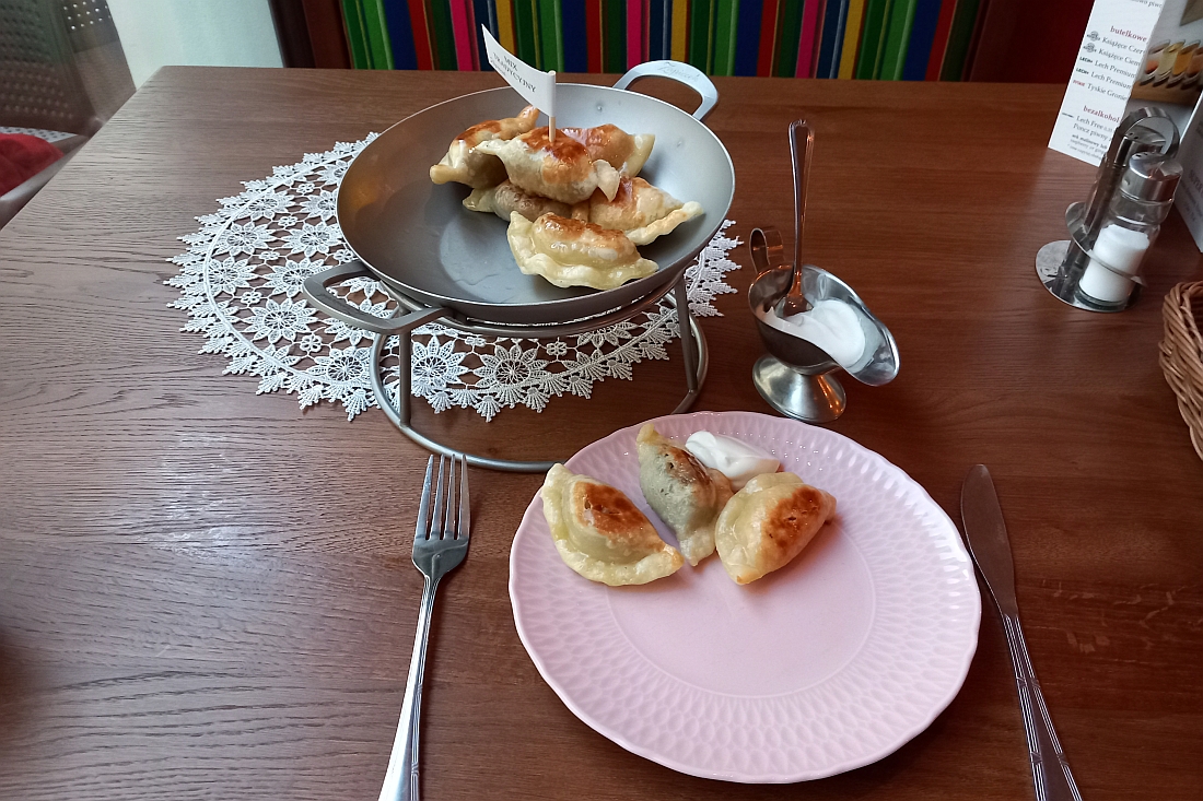 Nach meiner Bestellung des Kotlet schabowy (kein Schaben-Kotelett, sondern ein Schweineschnitzel) beginnt die Bedienung/Bardame/Köchin in Personalunion, in der kleinen Küche Fleisch zu klopfen und Kartoffeln aufzusetzen. Beim Polen wird frisch gekocht!