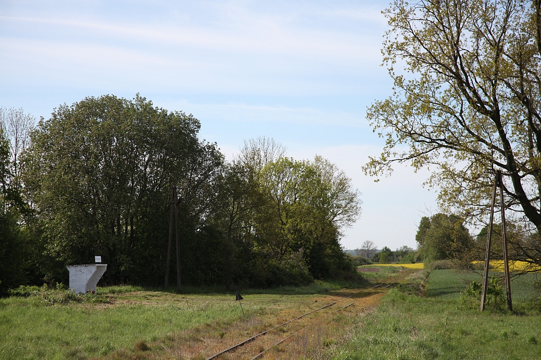 Der weiterführende Gleisrest im Vordergrund mag daran erinnern, dass das Netz der Greif(f)enberger und Stargarder Meterspurbahnen einst über mehrere Hundert Kilometer lang gewesen ist.