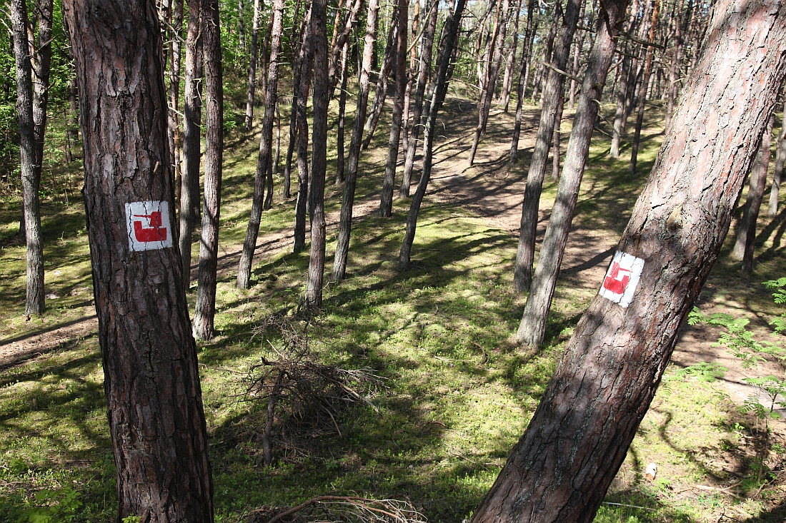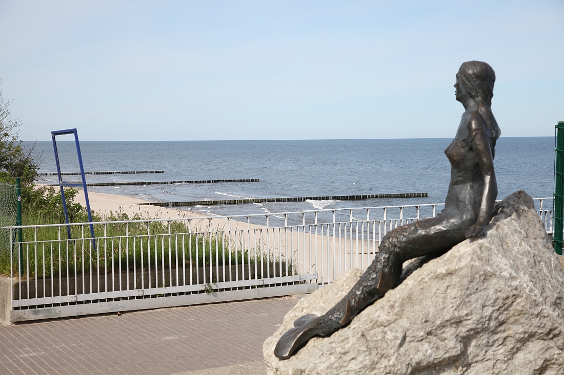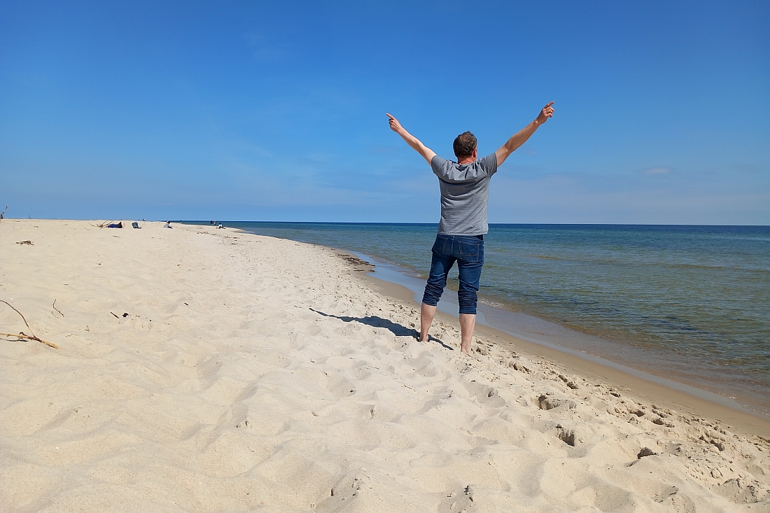 In Trzęsacz, dem ersten Ort an der Küste, verlasse ich den Zug. Die faule Schaffeuse hat es in den letzten eineinviertel Stunden nicht für nötig gehalten, mich abzukassieren und hockte (oder schlief?) lieber in ihrem Dienstabteil. Meinetwegen... Also, danke für die Fahrt! Ich belohne mich selbst erst einmal mit dem ersten Blick aufs Meer. Ach, schön!
