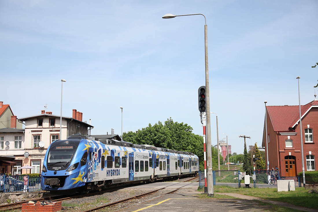 Ein hypermoderner Hybrid-Triebfix bingt mich auf der eingleisigen Strecke Richtung Kołobrzeg/Kolberg bis Gryfice.