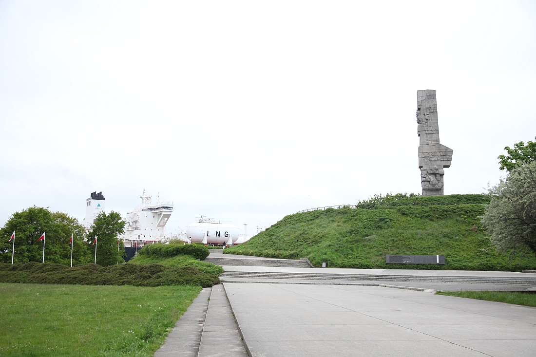 Dort, wo ein Schuss des deutschen Kriegsschiffes "Schleswig-Holstein" auf die polnische Halbinsel Westerplatte vor 85 Jahren den Beginn den 2. Weltkrieges markierte, befindet sich heute eine Gedenkstätte mit Monument. Im Hintergrund sieht man gerade den Flüssiggastanker "Robert Habeck" auslaufen.