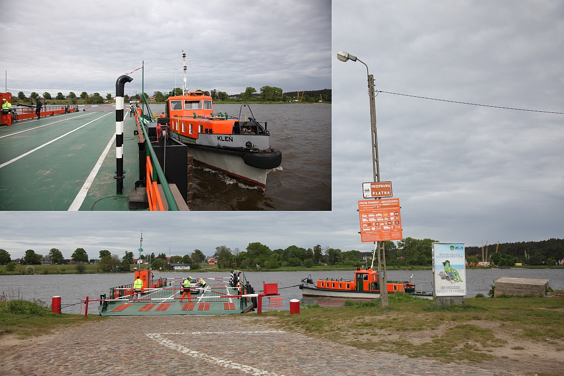 Die Fähre besteht aus einem offenen Ponton mit Auffahrrampen, an dem längsseits ein kle(i)ner Motorkahn festmacht und den Ponton über die Weichsel zieht (kleines Bild). Nicht weniger als vier Mann Personal sind auf dem "Schiff" beschäftigt. Am anderen Ufer dreht der am Vordersteven mit dem Ponton vertäute Kahn über den Bug um 180 Grad (großes Bild), und es geht zurück.