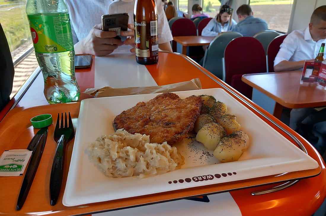 Der polnische Dreiklang (II): Kartoffeln, Fleisch, Rohkost. Frisch gekocht im Intercity-Barwagen!